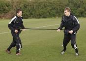 The attacker tries to break away from the defender, during multi-directional quickness drills, by ripping the Velcro tab on the umbilical between the two.